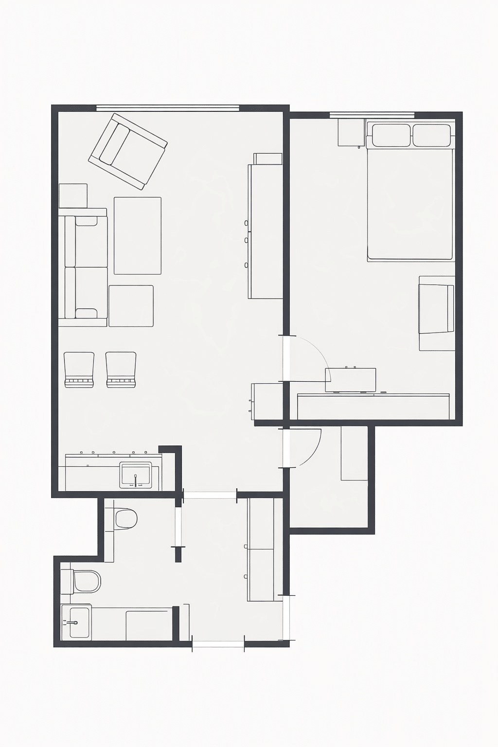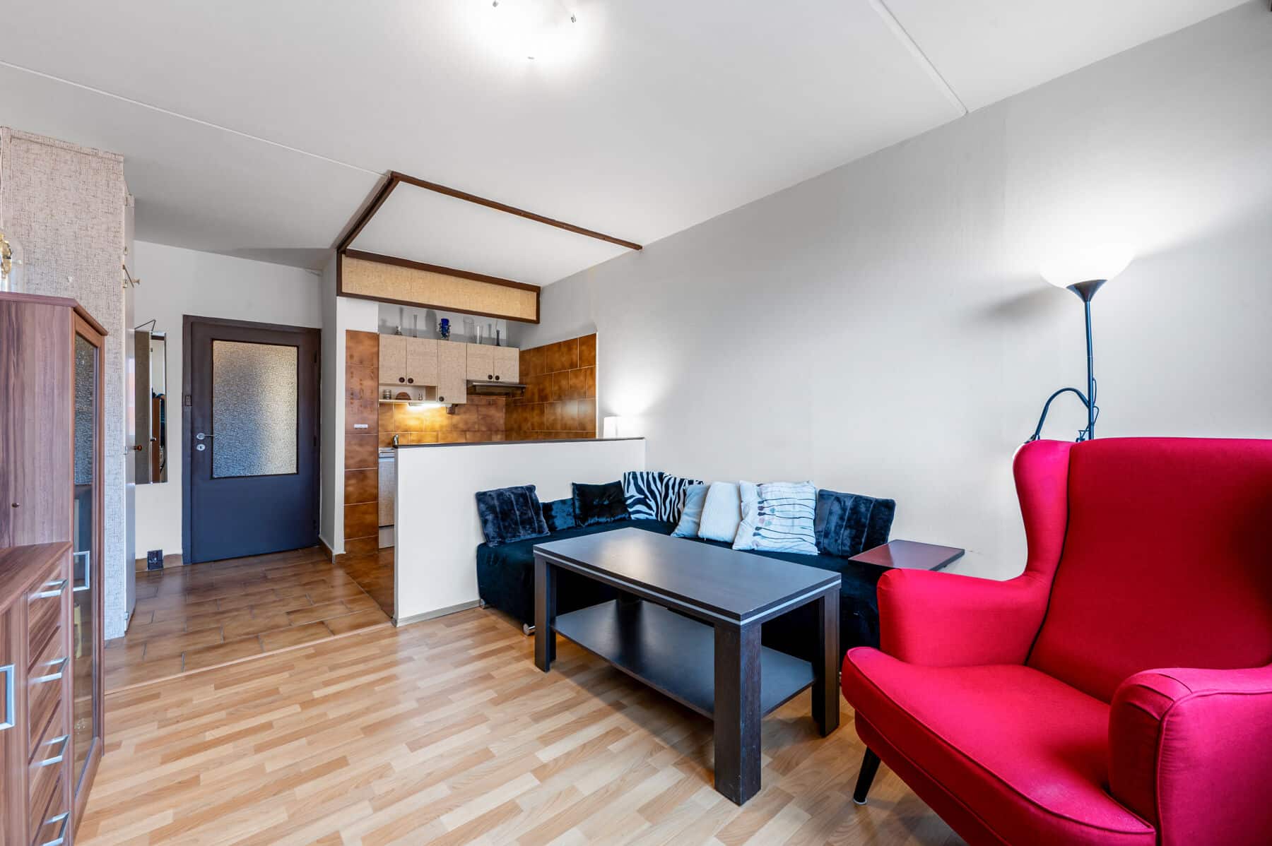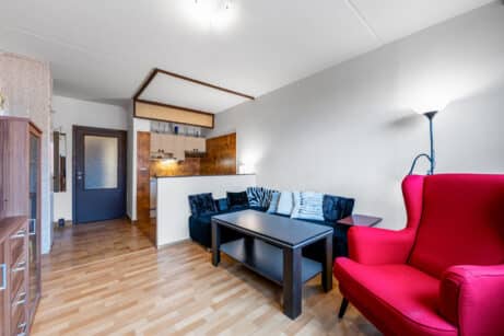 Byt se sestává ze vstupní chodby, koupelny s WC, obývacího pokoje s kuchyňským koutem (20 m2), pokoje (12 m2) a komory. Vytápění bytu a ohřev vody je dálkově. K bytu náleží komora přímo v bytě.