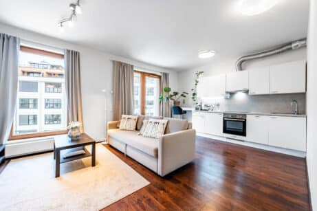 Elegantní byt 1+kk o rozloze 34,9 m2 s balkonem na 4. NP s výtahem v nově postaveném domě z roku 2020 v ulici Naskové, atraktivní části Prahy Košíře, nabízí nadstandardní komfort.